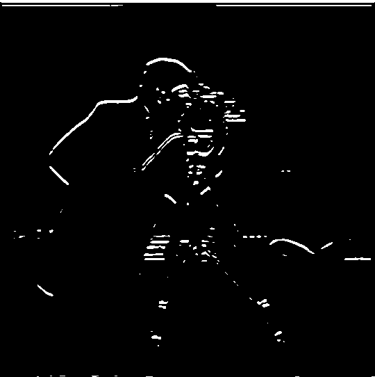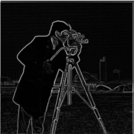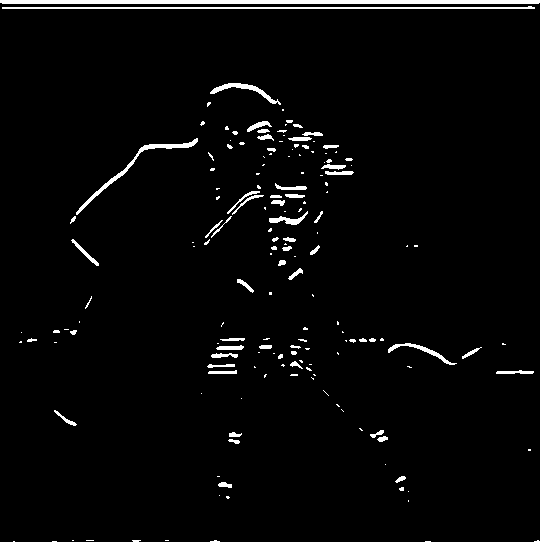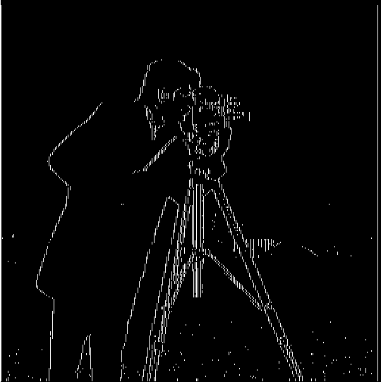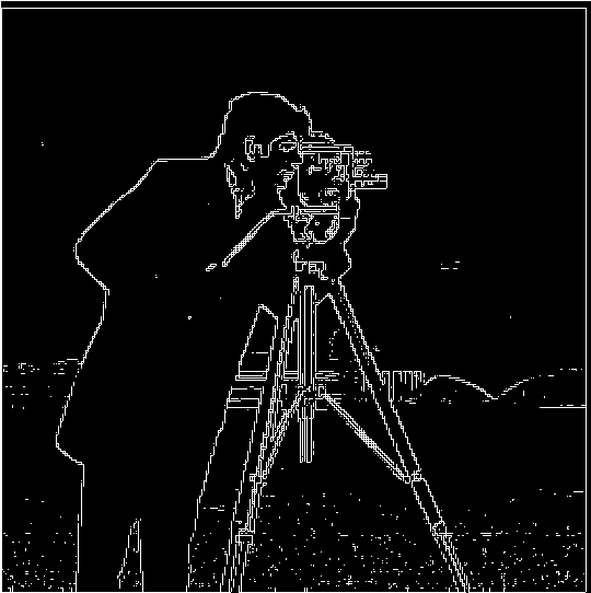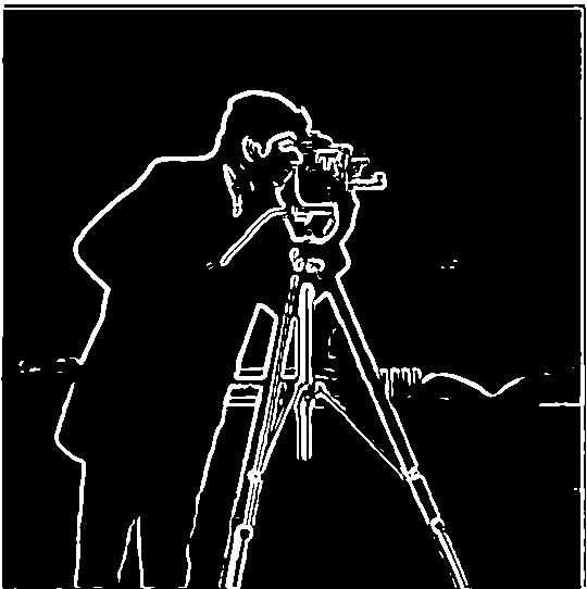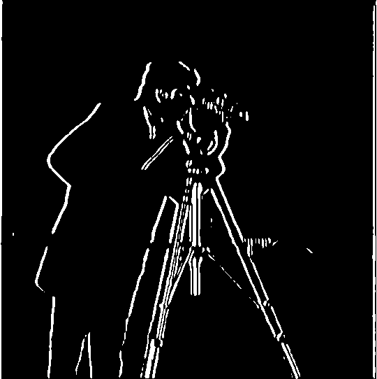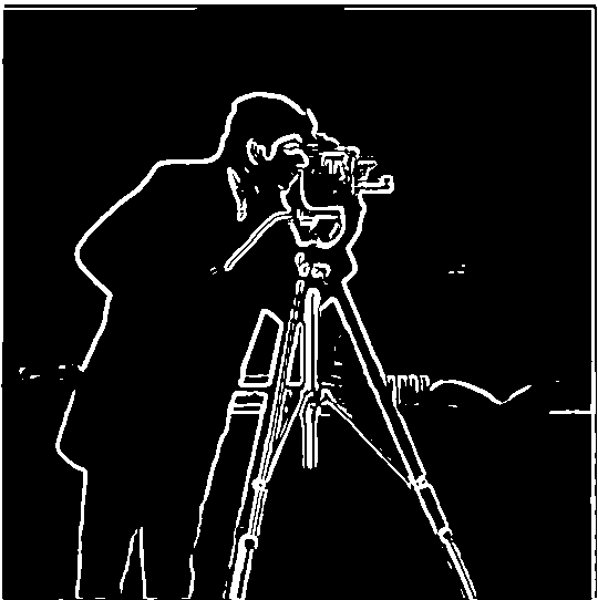 There are some noticeable differences in the final result using this approach. For one, the binarized edges are thicker and rounder than before. Also, the small bits of noise at the bottom of the image as well as the fine details inside the camera are completely gone.