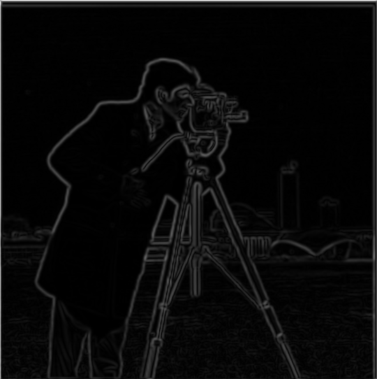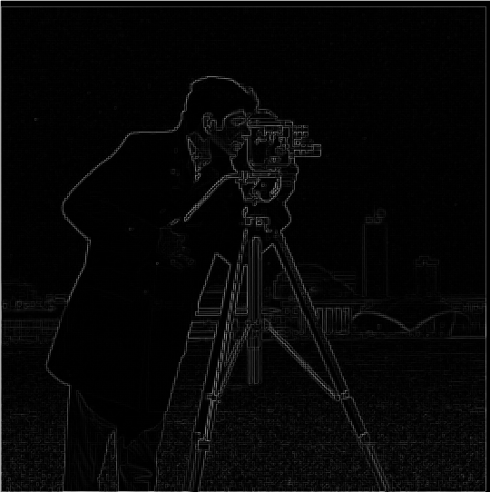 For each of the two partial derivatives, a finite difference kernel was created as a Numpy array. dx_kernel = np.array([[1, -1]]) and dy_kernel = np.array([[1], [-1]]). These two kernels were used to convolve the original image using scipy.signal.convolve2d with mode='same' to produce images of their respective partial derivatives. These values were combined into a single edge image by calculating the pixel-wise magnitude of the gradient using np.sqrt(dx_deriv ** 2 + dy_deriv ** 2). This is essentially treating the respective pixel values of the two partial-derivative images as elements in the gradient vector and taking its L2 norm as the final pixel value.