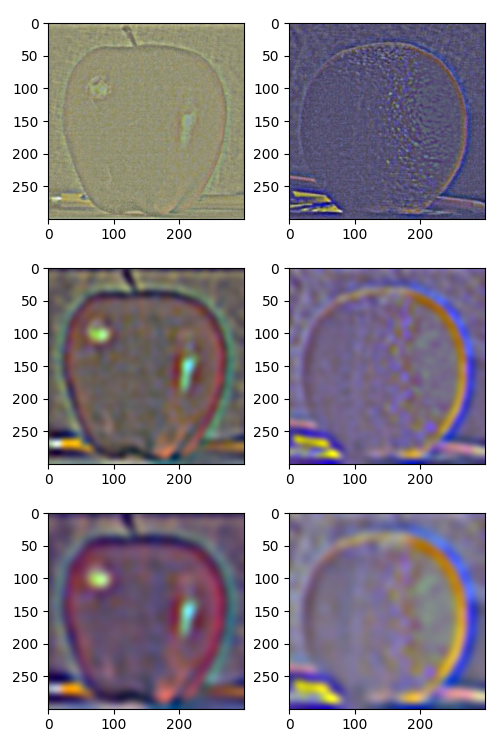 From top to bottom, the Laplacian stack images for the apple (left) and orange (right) at levels 0, 2, and 4 are shown below: